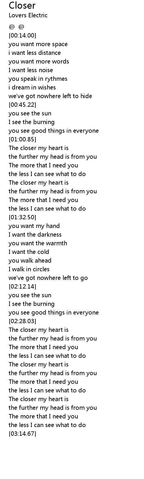 The Chainsmokers - Closer (Lyric) ft. Halsey, Official Lyric Video for "Closer" by The Chainsmokers Listen to The Chainsmokers: https://thechainsmokers.lnk.to/listenYD Watch . We Have got 13 images about Closer Lyrics images, photos, pictures, backgrounds, and more. In such page, we additionally have number of images out there. Such as png, jpg, animated gifs, pic art, symbol, blackandwhite, images, etc. "Ne-yo Closer (With Lyrics)", It says adele because I'm called Adele.. "The Chainsmokers - Closer (Lyrics) ft. Halsey", Subscribe and press ( ) to join the Notification Squad and stay updated with new uploads Follow The Chainsmokers ..